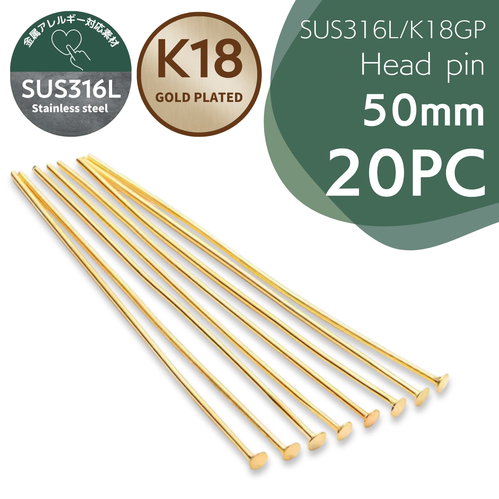 SUS316Lサージカルステンレス製にK18GP(18金メッキ)を施し、さらに樹脂コーティングを行いよりアレルギーの出にくくなったTピンとなります!30mm〜ございましたがサイズ違いも同じ太さかつ同価格の為50mmのみの取り扱いとなります。