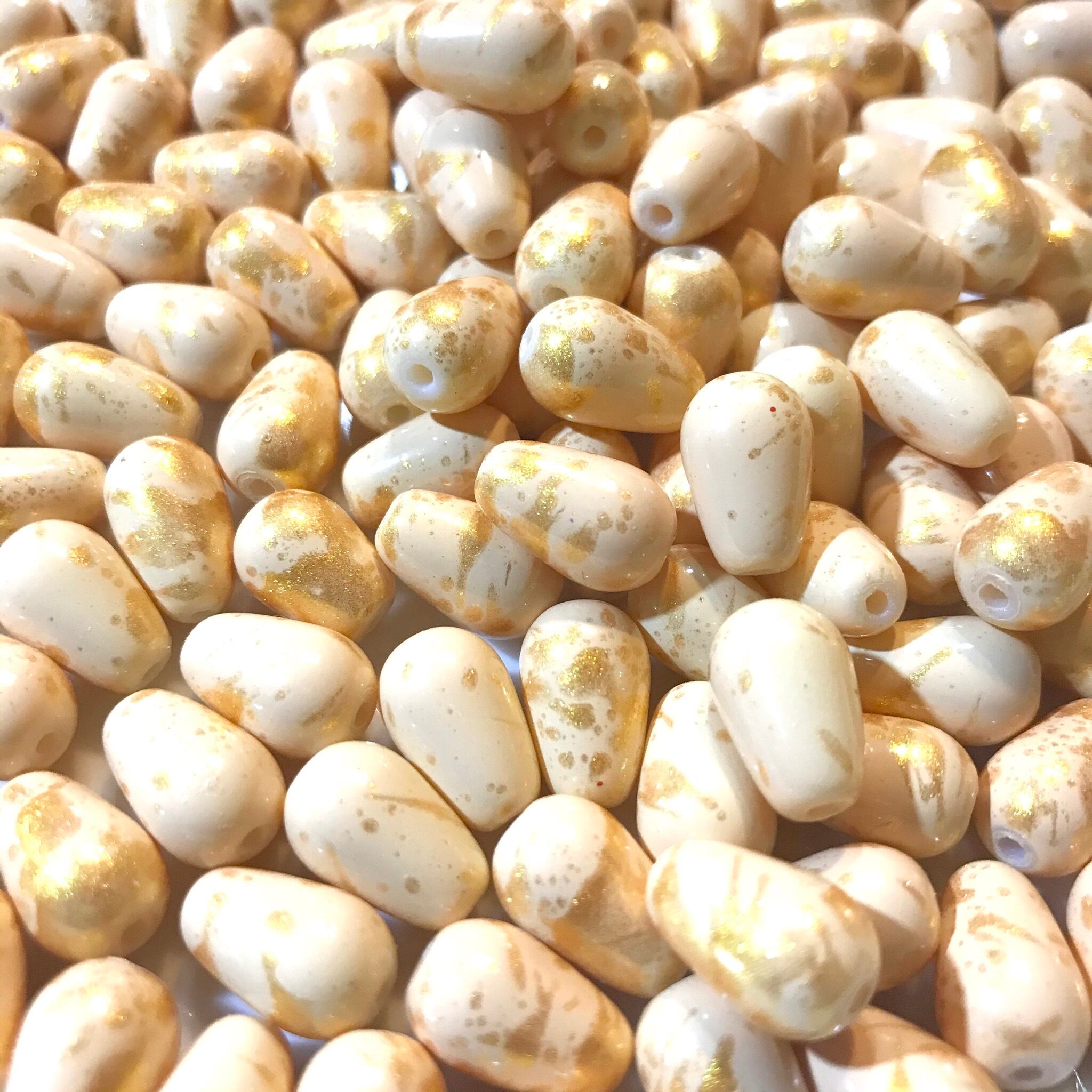 ティアドロップ型の艶ありベージュにマットゴールドを吹き付けた様なマーブル模様がアンティーク感もありオシャレなガラスビーズです。アメリカインポートの為ゴールドの吹付に割とムラがありゴールドの多い物とゴールドの少ない物が混在しておりますので予めご了承ください。