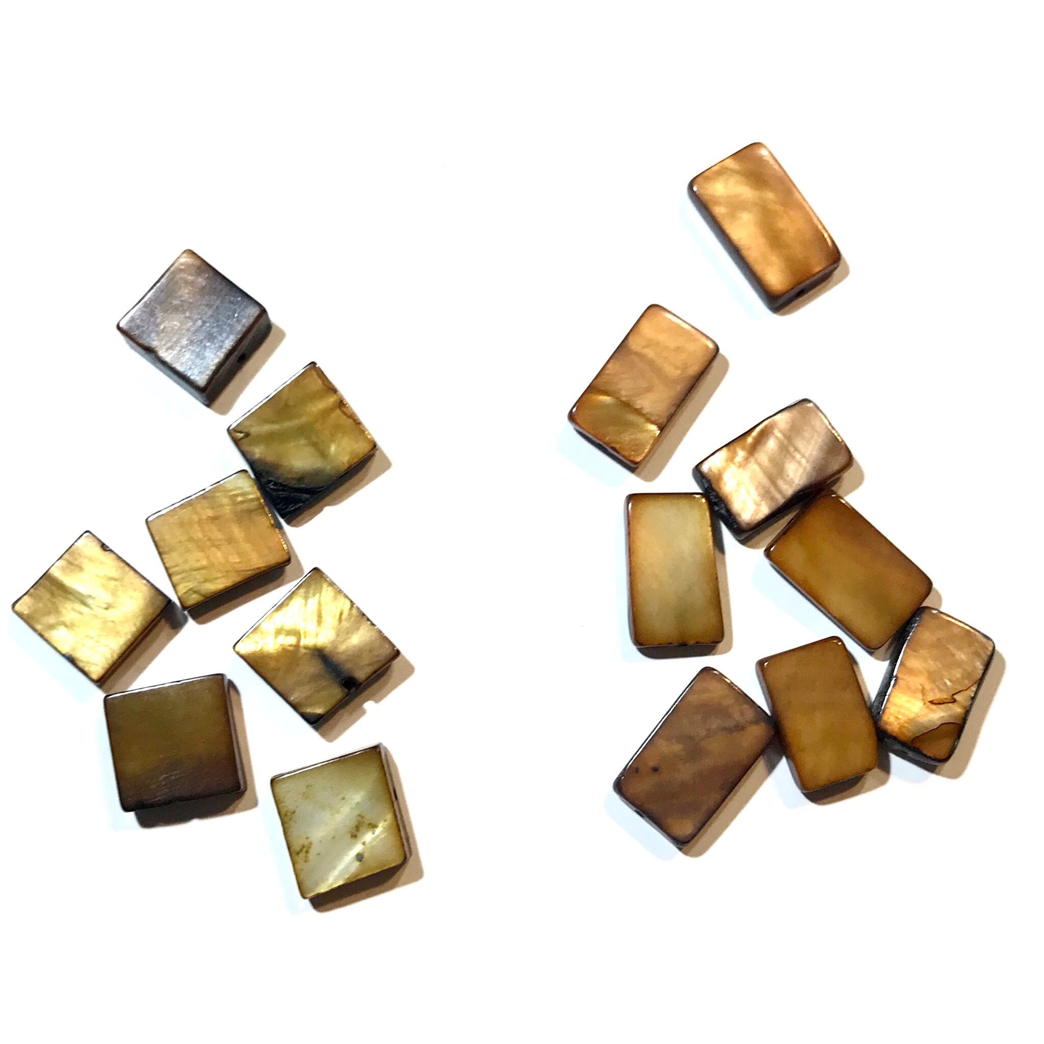 スクエア型はキャメルブラウン、レクタングル型はブラウンの落ち着いたカラーリングがお洒落な淡水シェルビーズです。