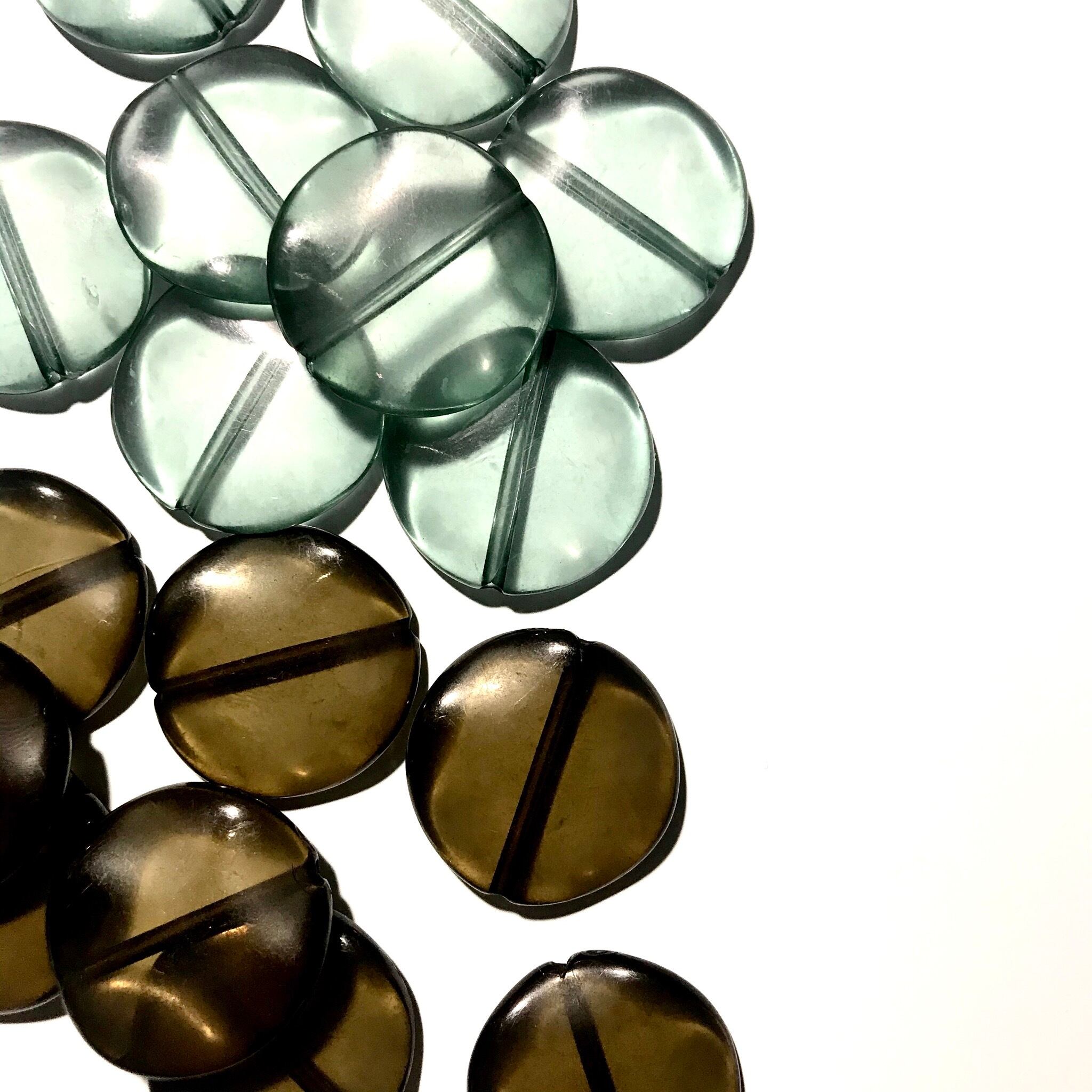 コイン型の大振りビーズにフリルの様な捻りのアレンジが入ったアクリルの手染めビーズになります。