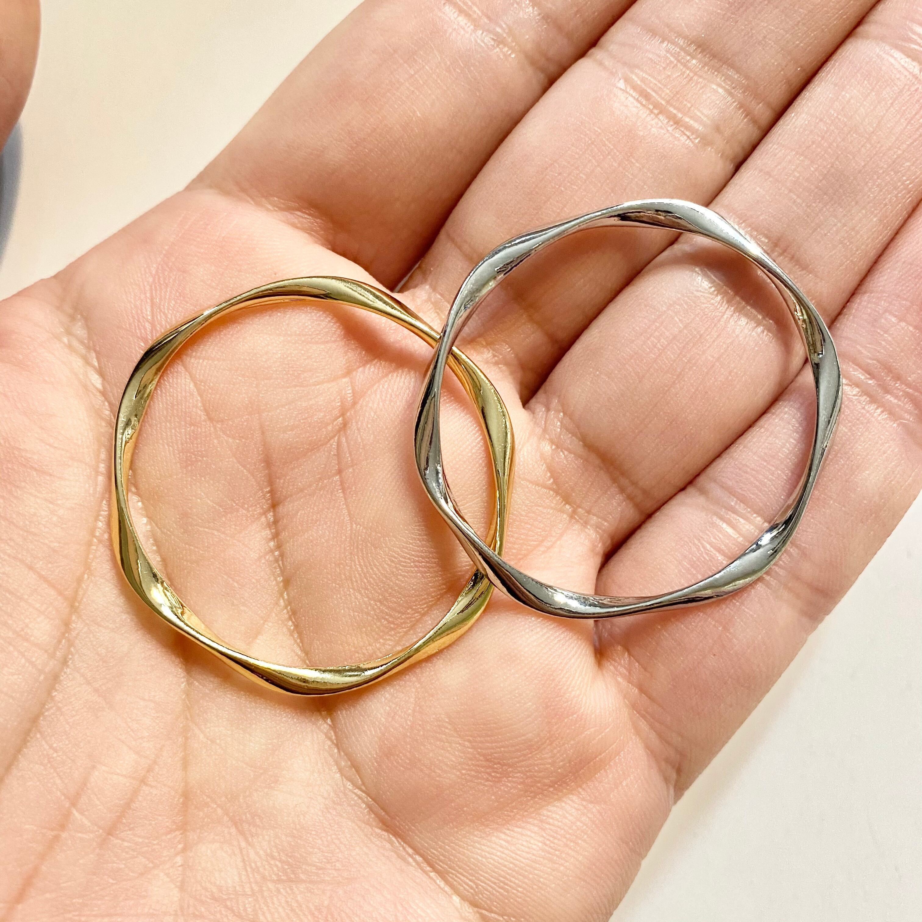 メタル素材の40mmビッグサイズのツイストサークルフレームパーツですd(゚ε゚*)ピアスはもちろんですが、ブレスレットのベースにしたりヘアアクセサリーのベースにしたりと切れ目の無いデザインなので様々なアレンジで幅広く使えるマストアイテムです(´▽`)