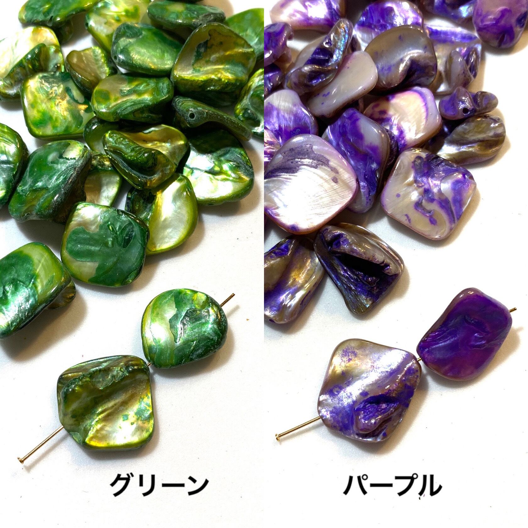 天然形状をそのまま生かしたデザインが魅力的な淡水シェルの染めビーズになります☆シェルの艶感と染めカラーがどのカラーもナチュラルなテイストでカジュアルな作品にもピッタリd(゚ε゚*)