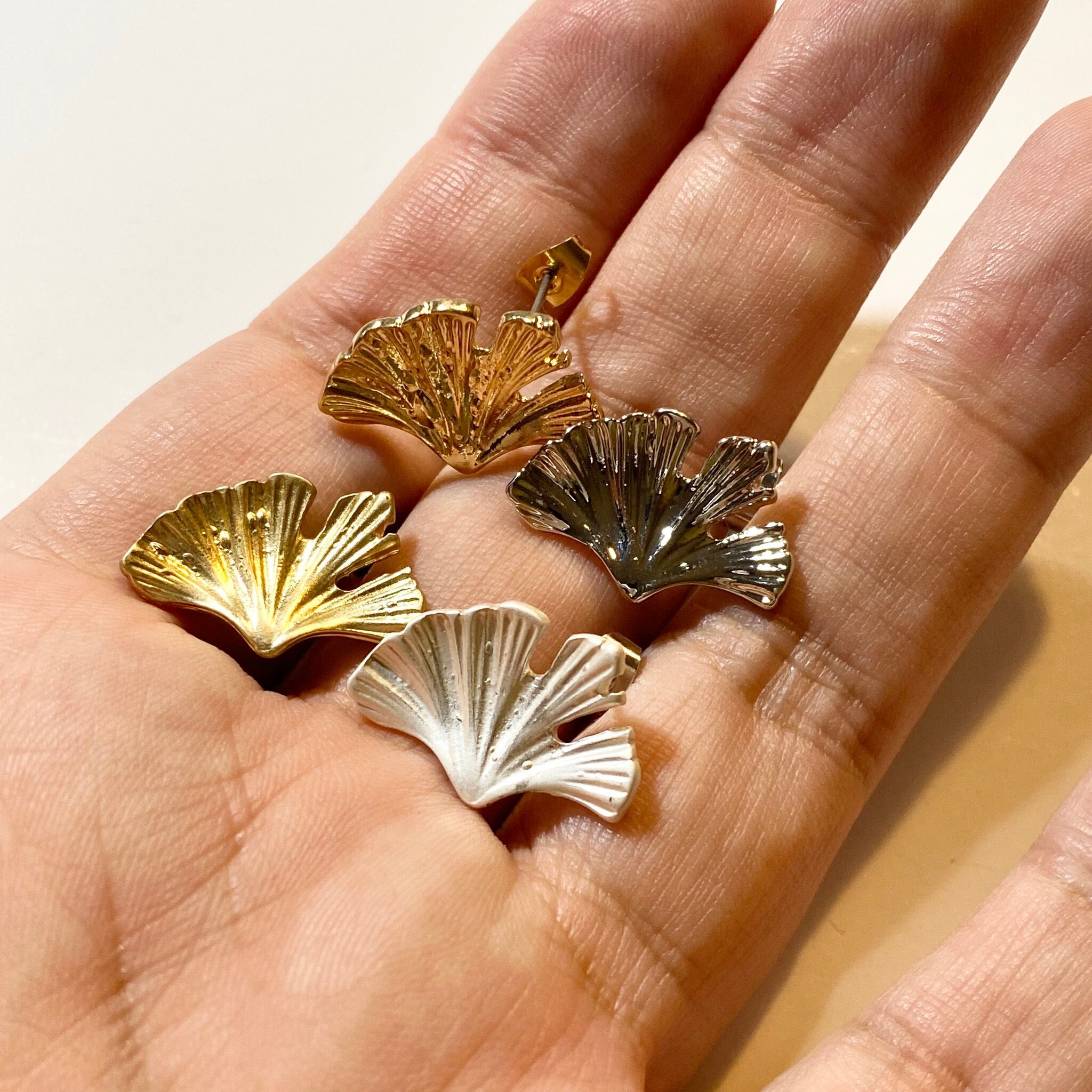 イチョウの葉をモチーフにしたデザインがとっても可愛いデザインポストピアスになります。カジュアルなマットカラーとエレガントな艶のあるゴールド/シルバーカラーの4タイプご用意致しました!