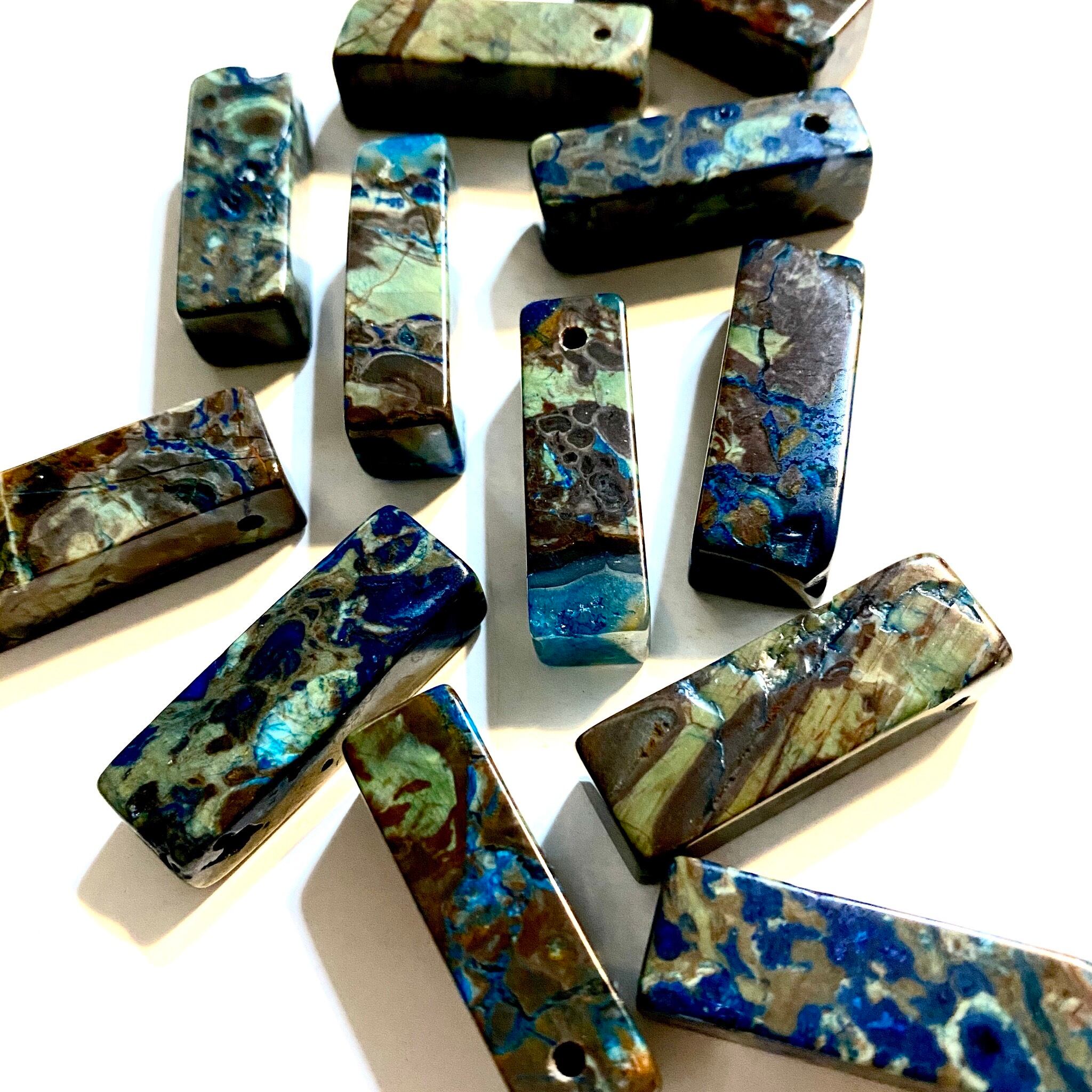 ブルー/グリーン/ブラウンなどの様々な色が混ざり合った希少な天然石オーシャンジャスパーを贅沢に30×10mmの大振りな立方体型にしたパーツですd(゚ε゚*)