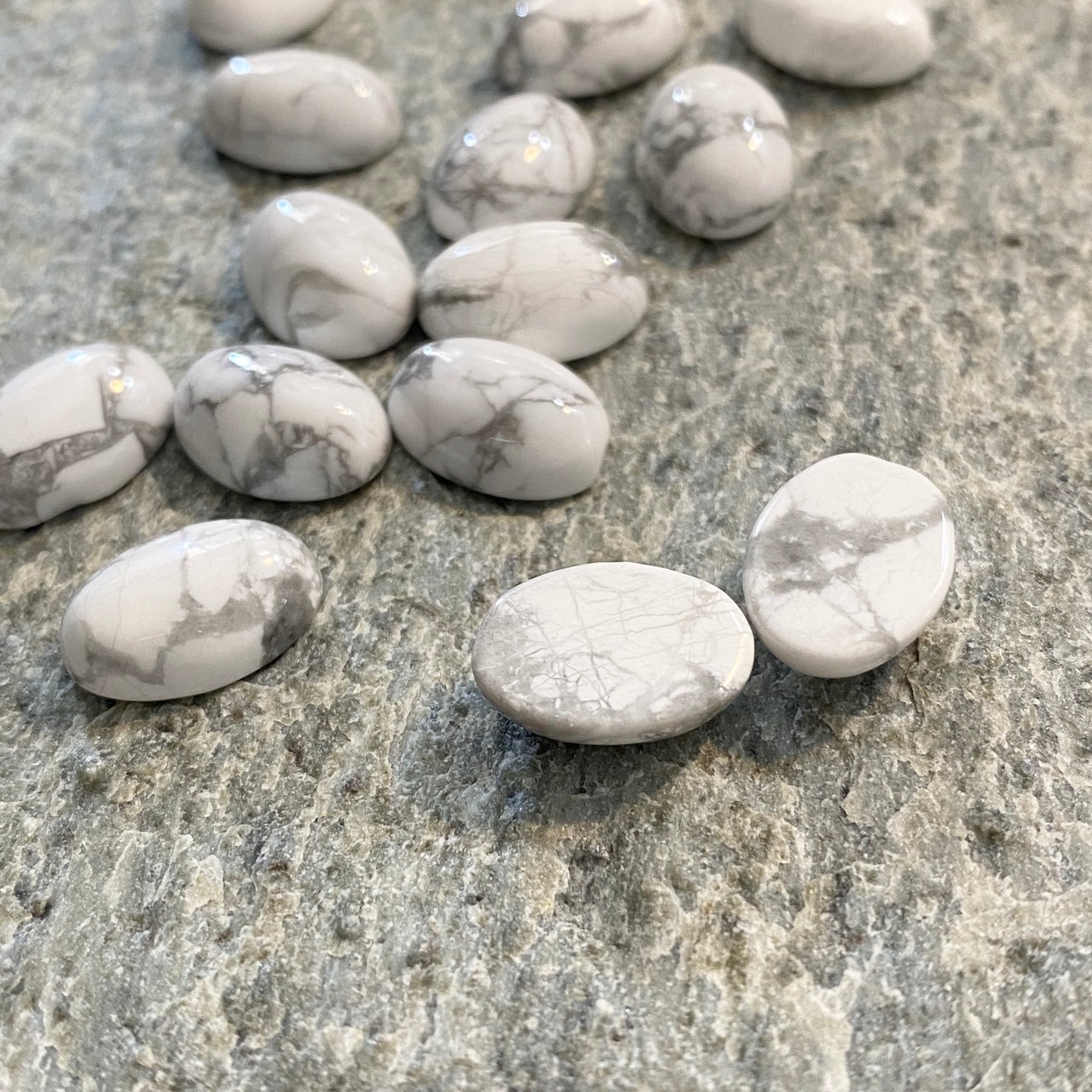 大理石の様なホワイトベースにグレーブラックの模様がシンプルともエレガントとも見える天然石「ハウライト」のカボションですd(゚ε゚*)