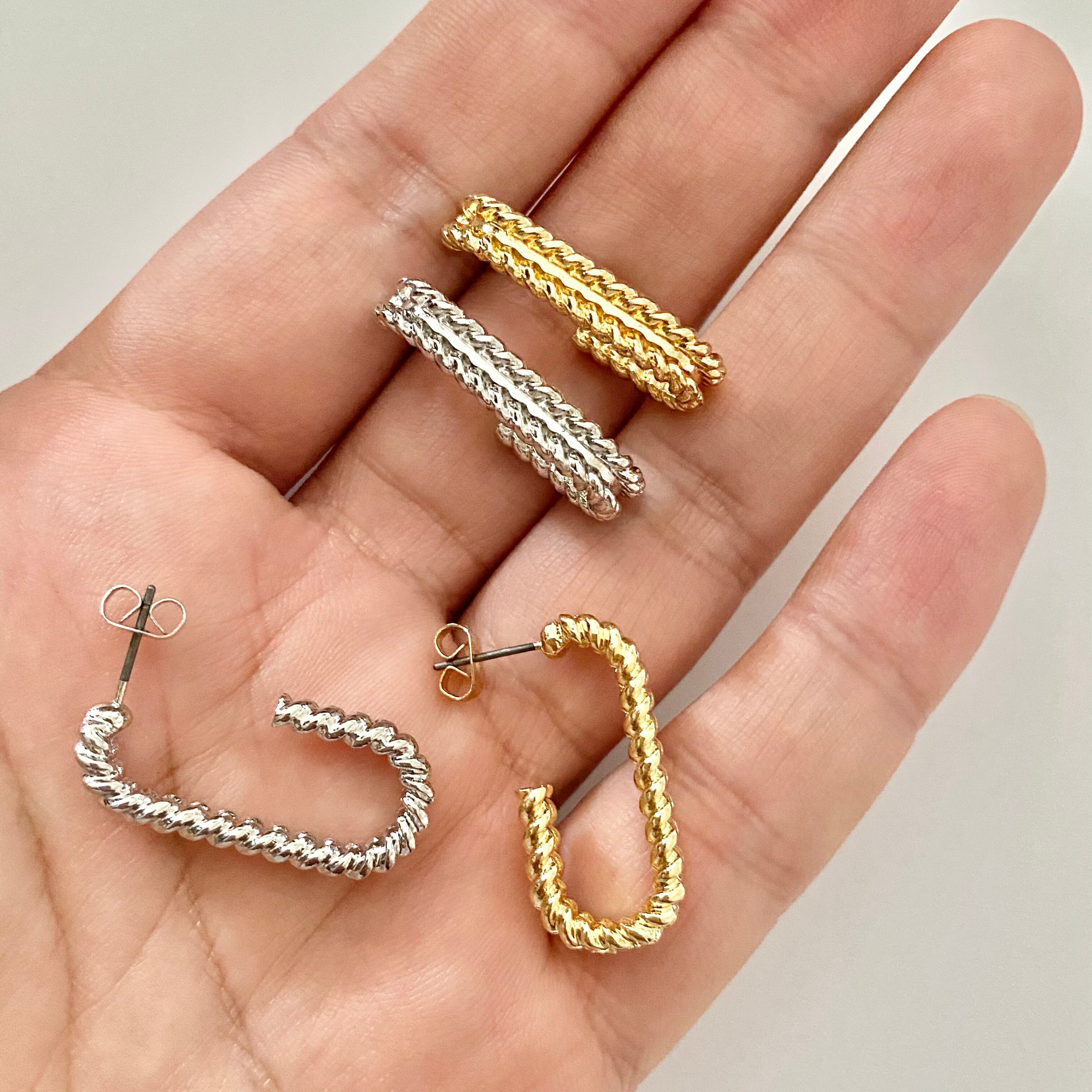 カジュアルな印象の編み込みデザインながら正面から見るとスタイリッシュなバーの様にも見え、大振りのフープなどであれば本体に直接通してのアレンジも可能なので大振りピアス作成にオススメですd(゚ε゚*)アレルギーのある人はもちろん!無い人にも安心なチタンポスト採用な点もオススメ!