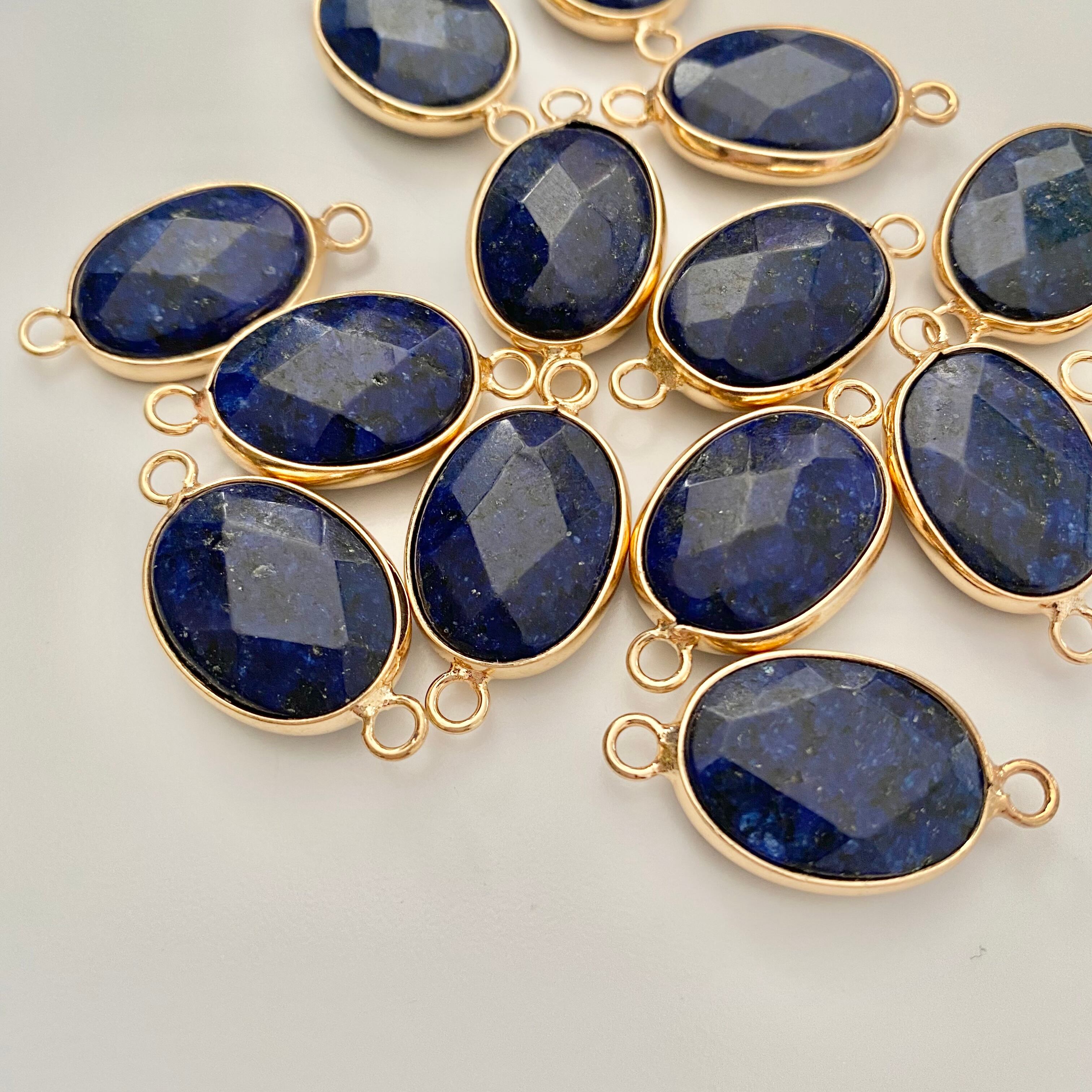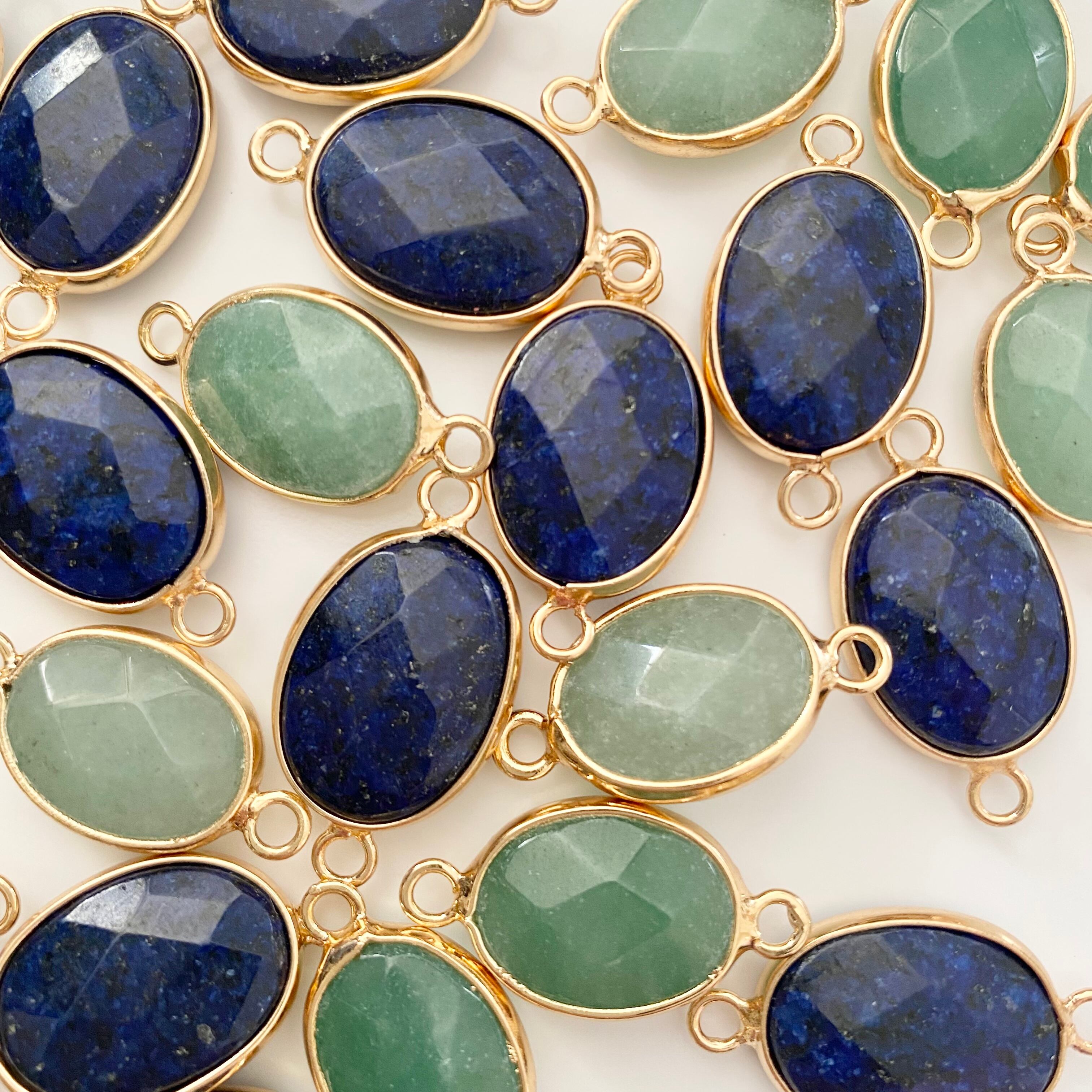 グリーンアベンチュリンとラピスラズリの多面カットデザインの天然石をメタルフレームで囲ったコネクターになります。