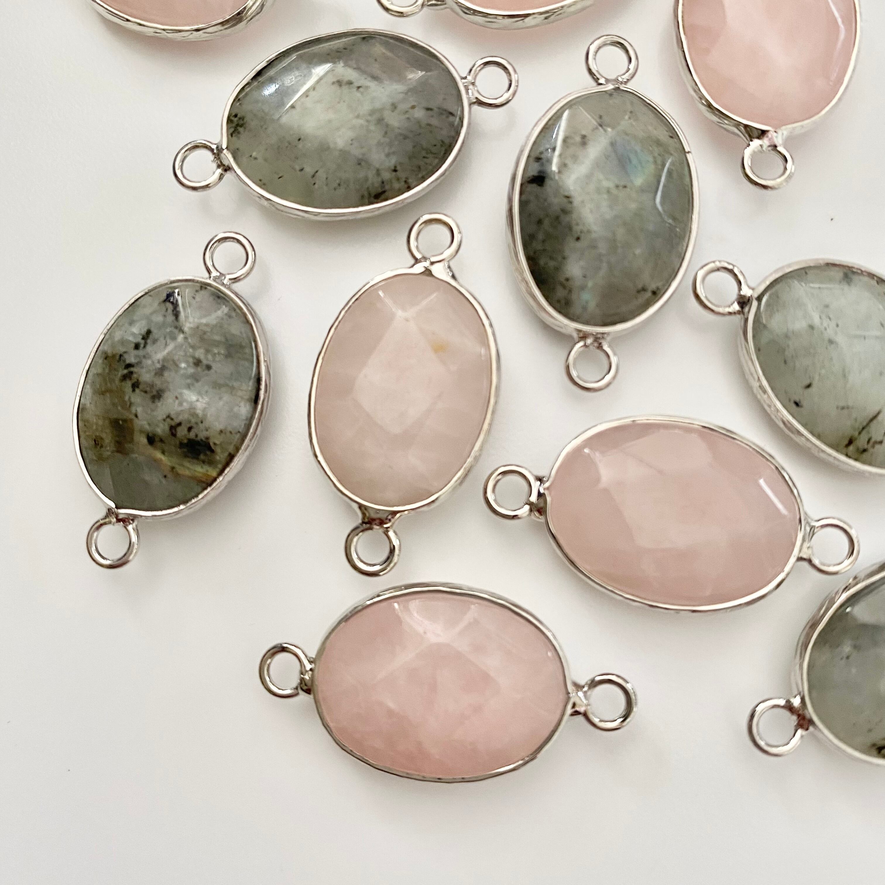 ラブラドライトとローズクォーツの多面カットデザインの天然石をメタルフレームで囲ったコネクターになります。