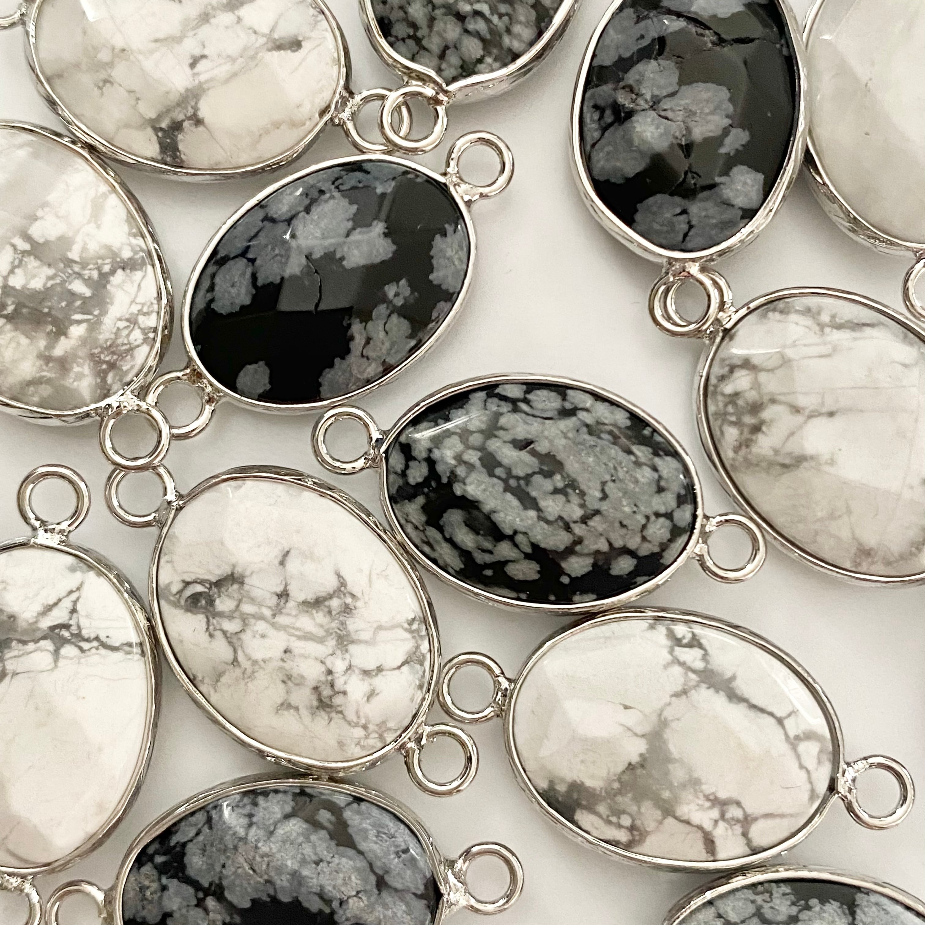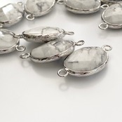 ハウライトとスノーフレークストーンの多面カットデザインの天然石をメタルフレームで囲ったコネクターになります。