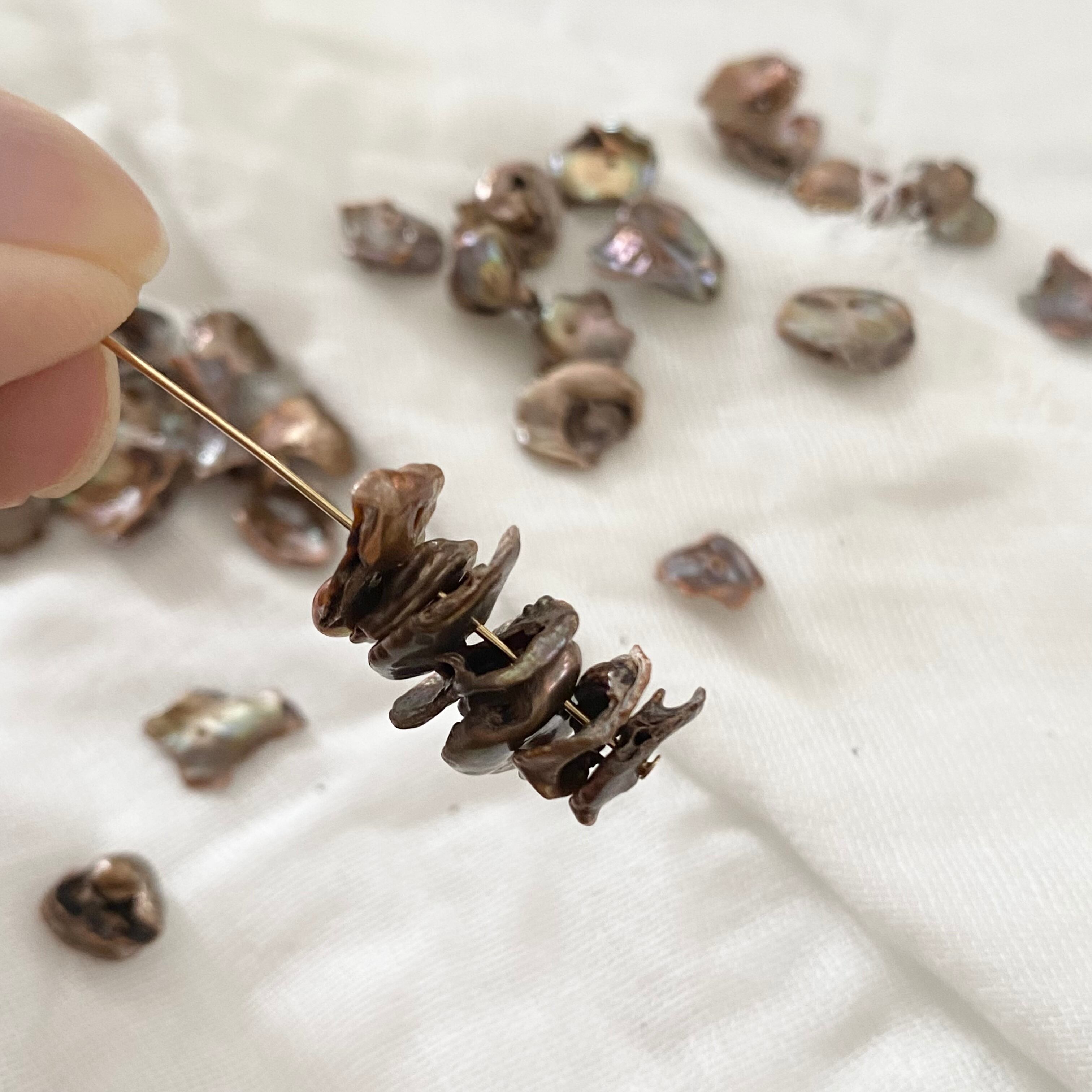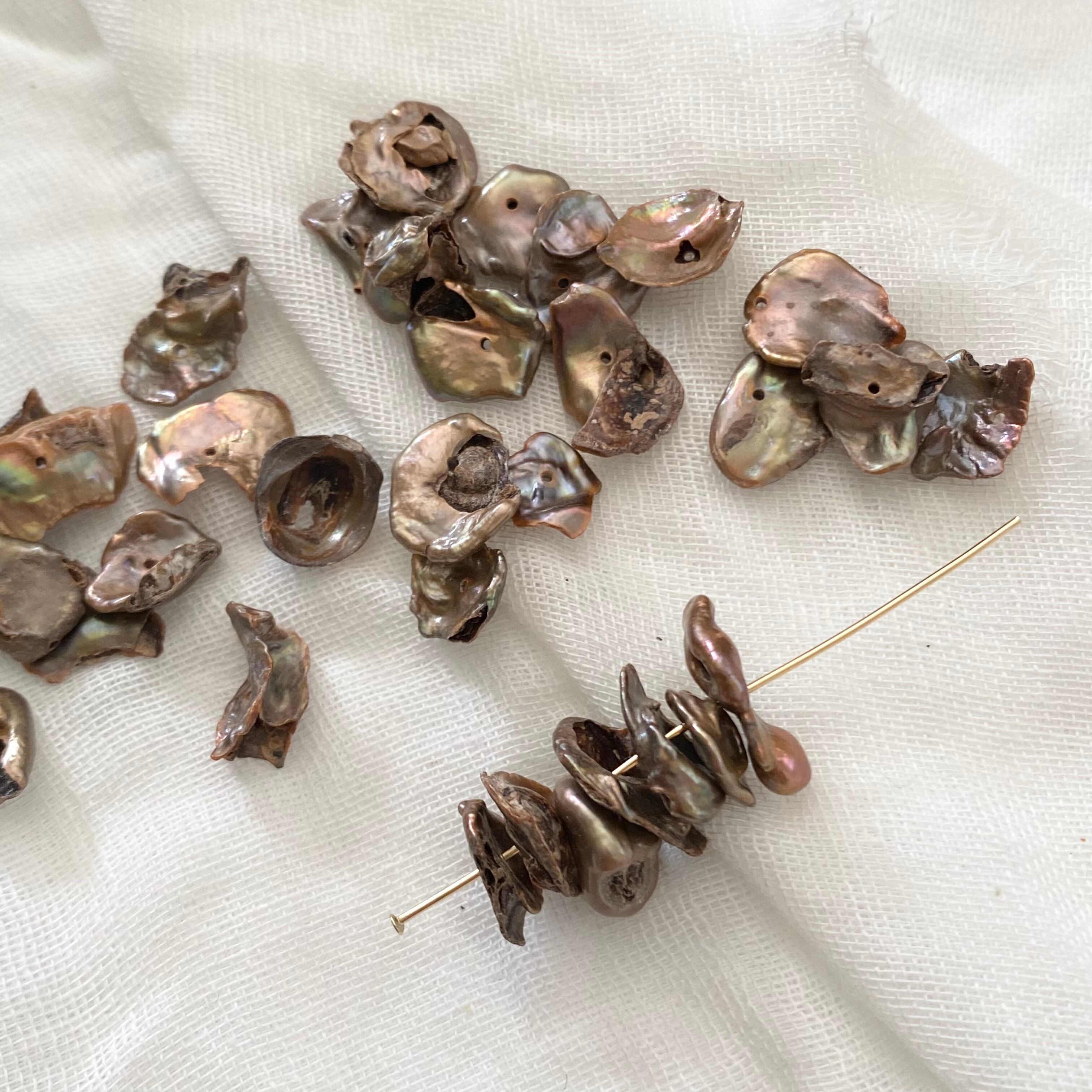 サイズ感の異なる暗めのブラウンの染めパールです!小ぶりな物が多く花弁の様な形状のチップ型となっておりアクセントにご使用頂くもよし!重ねてアレンジしても良し!なアイテムとなっておりますd(゚ε゚*)