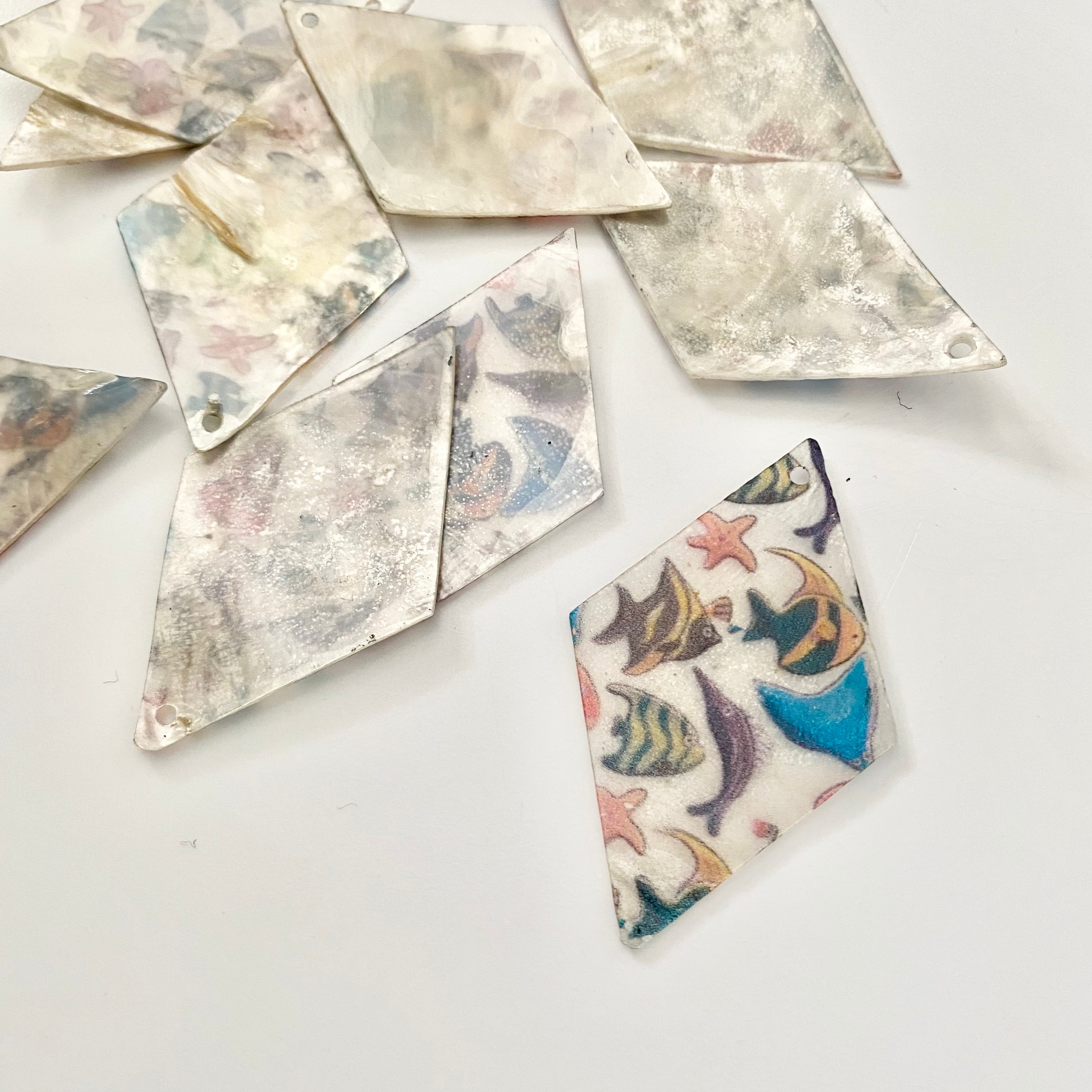 人気のカピスシェルにヴィンテージスタイルの海の生き物をプリントしたインパクト大なアイテムです!ピアスもオススメですが、ネックレスなどにアレンジして頂くのもオススメですd(゚ε゚*)