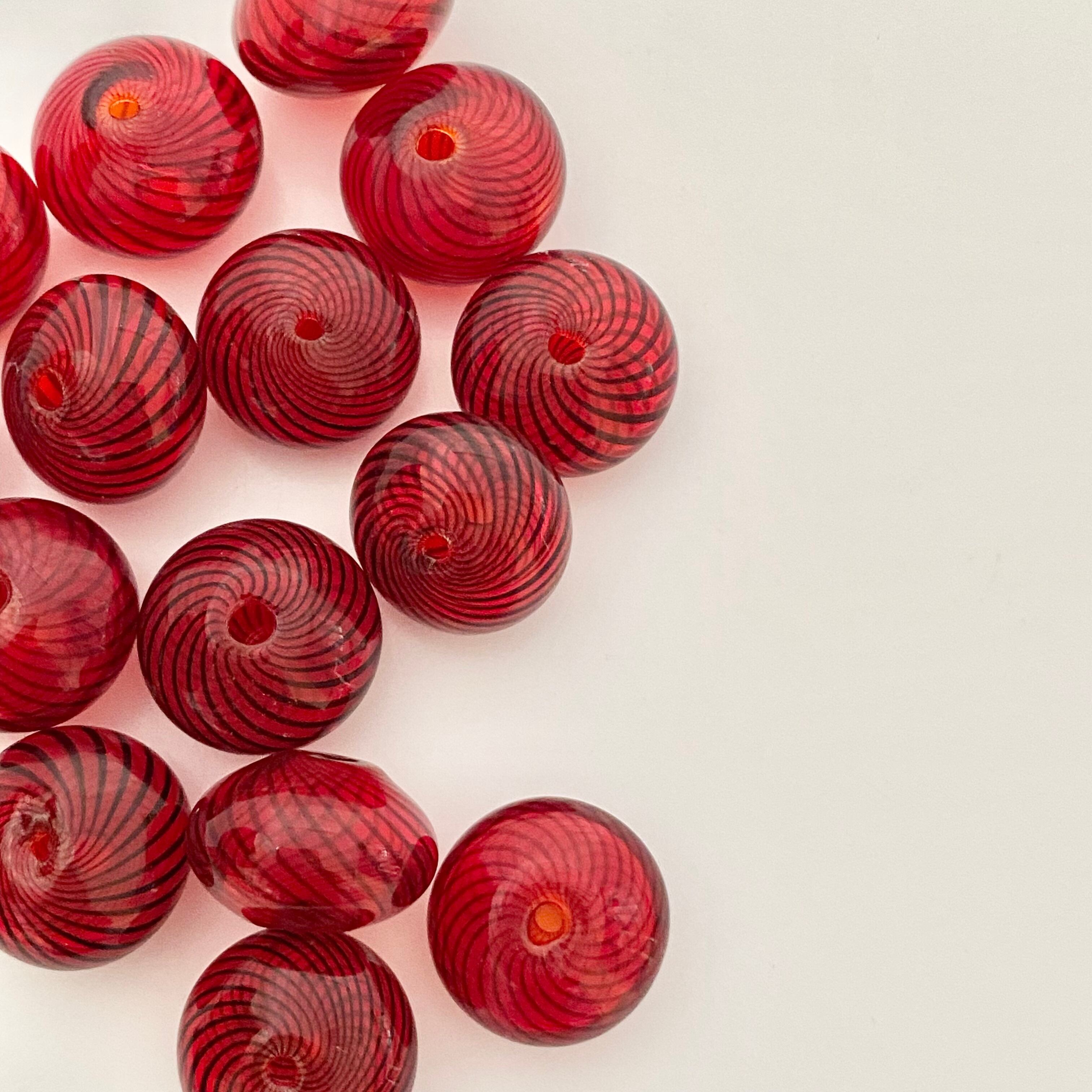 渋みのあるダーク目のレッドにさらに濃いバーガンディレッドのスパイラルストライプ柄となっており、ぷっくりとしたランタン型。光に透けると模様が非常に美しく現れますので、室内と屋外で異なる表情がとっても魅力的なアイテムです!
